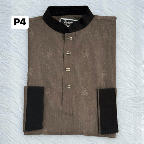Step up your style game with our Premium Mocha Brown Panjabi. Made from exclusive Pakistani Premium Grace Fabric, this piece features a unique self-textured pattern, contrasting black collar and cuffs, and sophisticated metallic buttons.